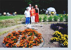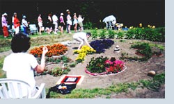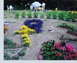 The Taoist yin/yang symbol was planted in black pansies. They grew well but were disappointing against the black soil. Suddenly they became vibrant when they were outlined with bright pink. The Hindu Om symbol also was improved with a red outline.